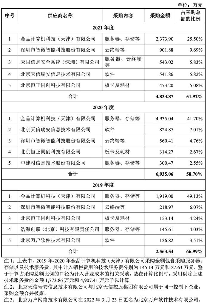 报告期内,麒麟信安采购的主要原材料包括存储、服务器、云终端等硬件以及外购软件,并且不存在向单个供应商的采购比例超过同期采购总额50%的情况。