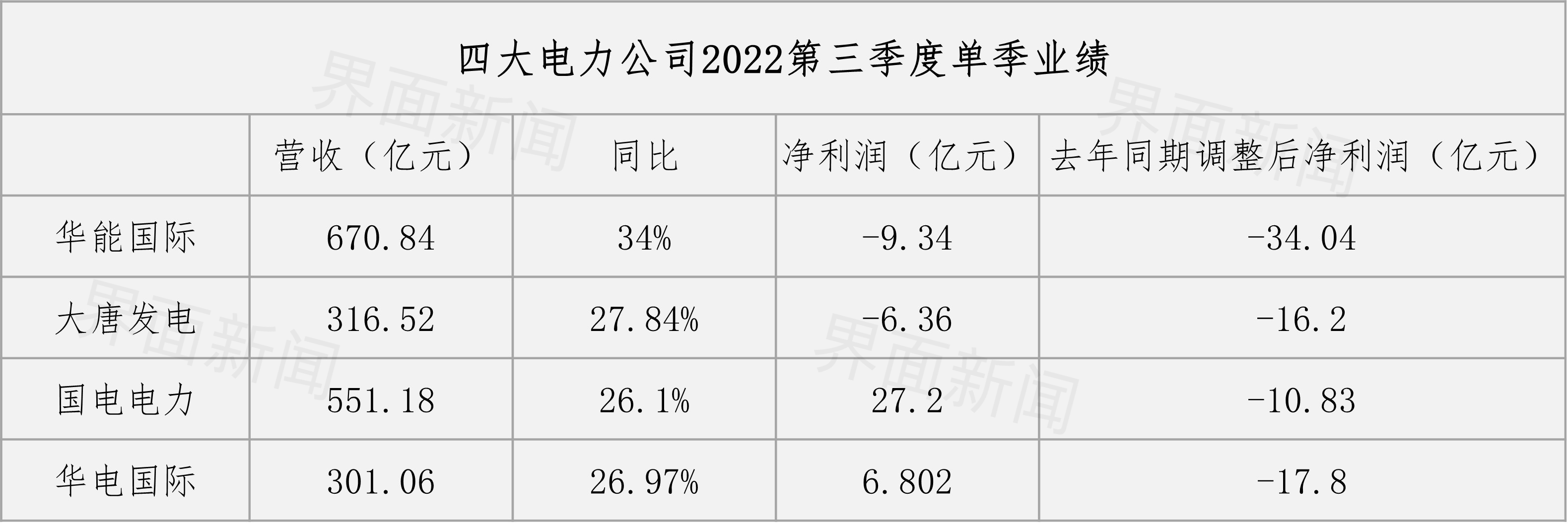 净利润方面,国电电力和华电国际三季度同比实现扭亏为盈;华能国际和大唐发电仍分别亏损9.34亿元和6.36亿元,但亏损额较去年同期分别降低72%和60%。