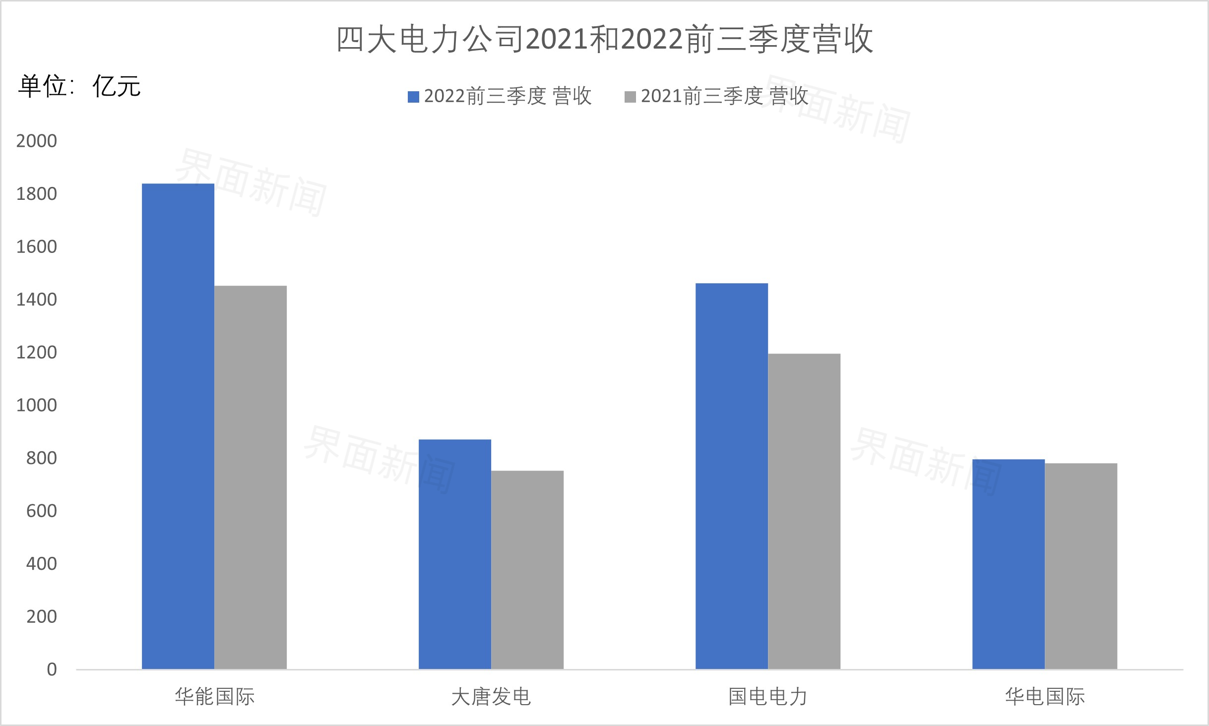 今年前三季度,四大电力公司营收也均实现增长。其中,华能国际营收为1839.53亿元,同比增27%,在四家公司中增幅最高。