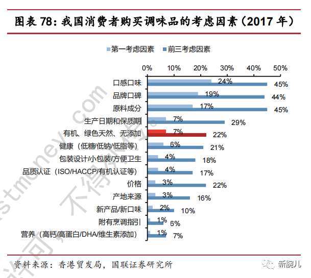 2017年,据香港贸发局对内地消费者的问卷调查显示,风味酱油和有机酱油的购买频率均有约30%的增长,消费者对口感、品牌和原料成本的关注,排在考虑因素前三位,无机添加类酱油是第一考虑因素,而价格的考虑因素占比只有3%。