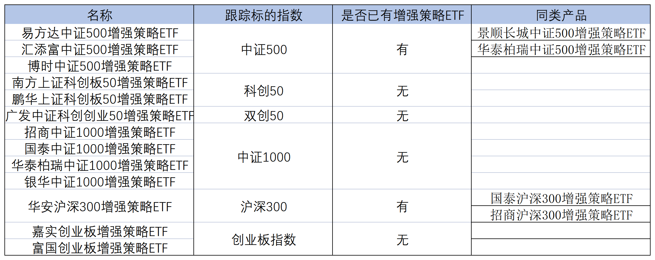 从产品名称来看,易方达、汇添富、博时报送的均是中证500增强策略ETF,南方、鹏华报送的是上证科创板50增强策略ETF,广发报送的是中证科创创业50增强策略ETF,招商、国泰、华泰柏瑞、银华报送的则是中证1000增强策略ETF,华安则上报了沪深300增强策略ETF,嘉实、富国则上报了创业板增强策略ETF。