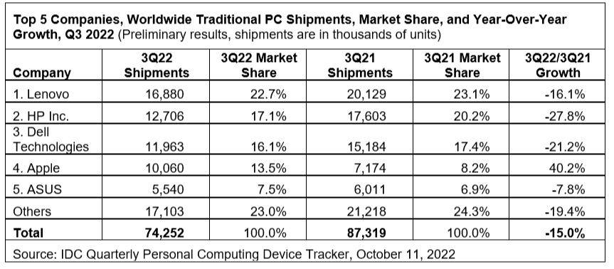 Strategy Analytics公布的最新数据显示,第三季度全球手机出货量同比下降9%,仅为2.97亿部。其中除了苹果取得6.4%的小幅增长外,三星、小米、OPPO、vivo等几家均出现不同幅度下滑,最高跌幅达到20%。而PC市场的处境就更为惨淡,IDC的统计数据指出,第三季度全球总出货量7420万台,同比下降15%。其中排名第一的联想销量同比下跌16.1%,惠普、戴尔跌幅均超过20%,只有苹果笑到了最后,靠着M系列芯片的强势取得40.2%的增长。