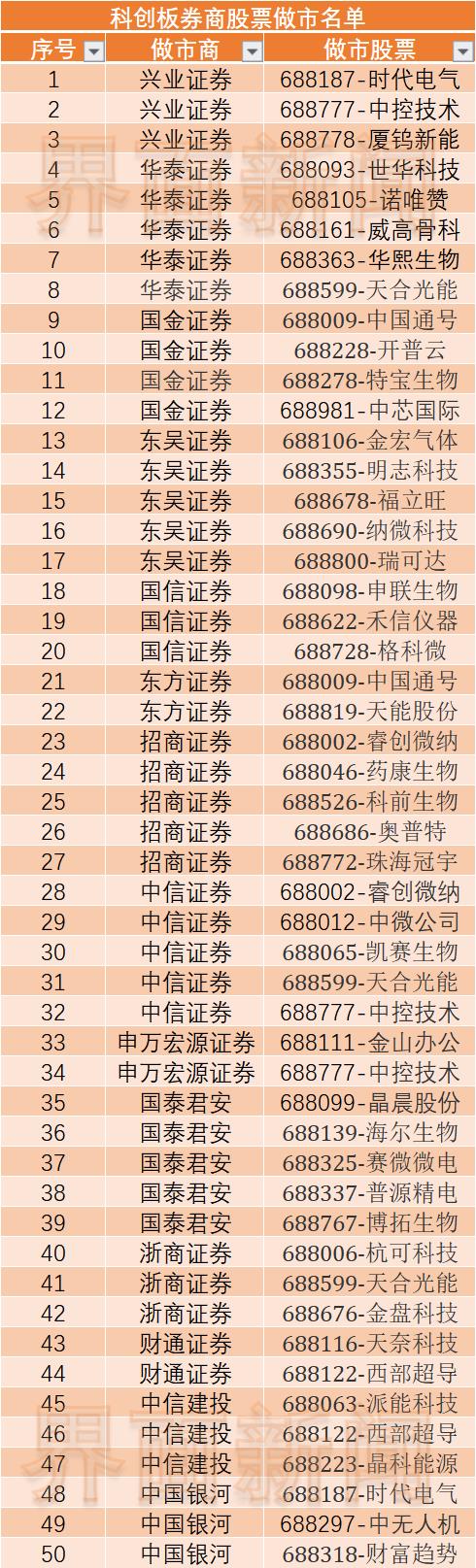 从个股上来看,中国通号、睿创微纳、西部超导、中控技术等均将由两家券商共同担任做市商。