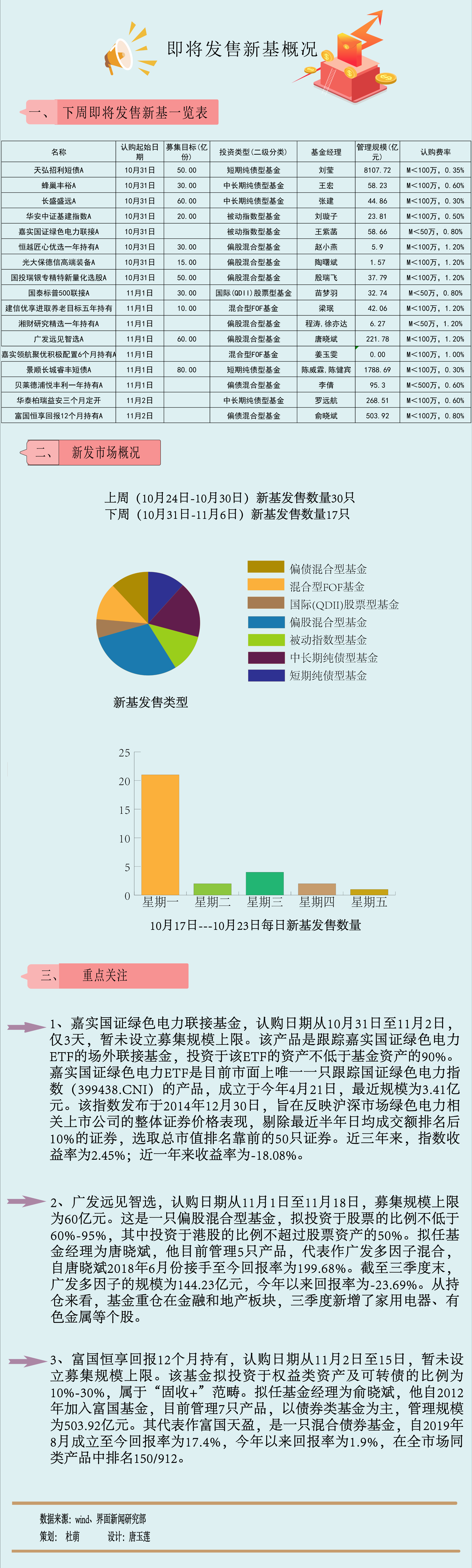 下周共计17只新品发售,偏股混合型基金有5只,纯债型基金有5只,混合型FOF有2只,偏债混合型有2只。从拟任基金经理的名单来看,较有知名度的基金经理包括广发基金唐晓斌和贝莱德基金李倩。