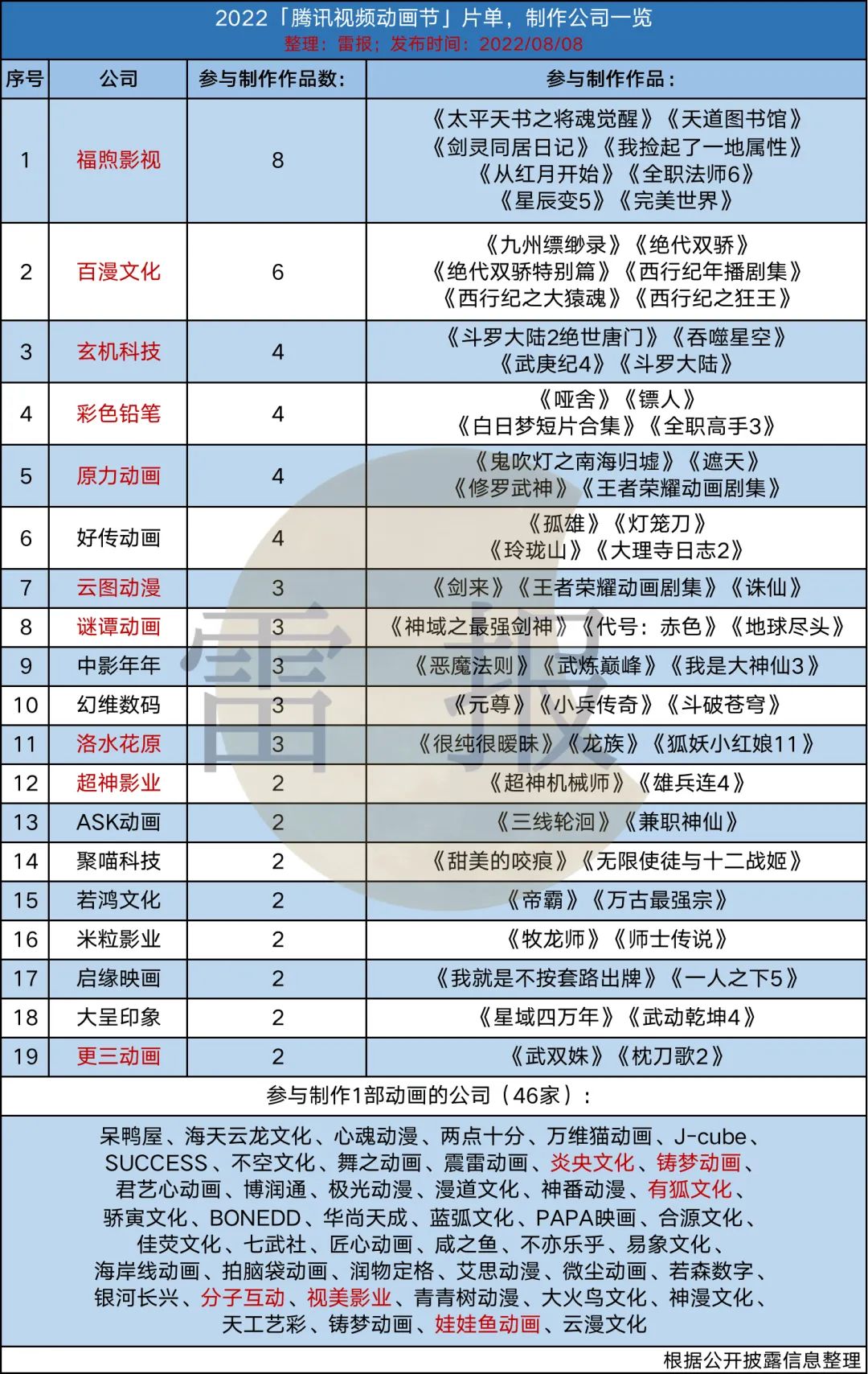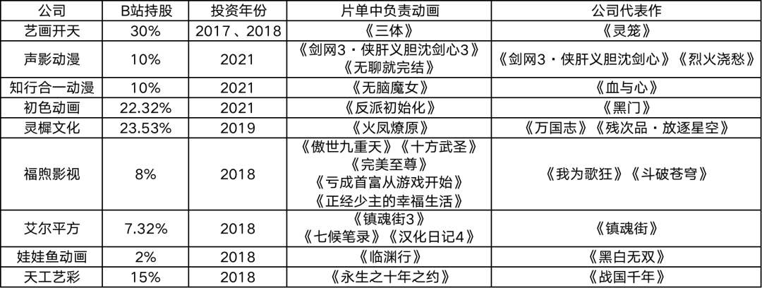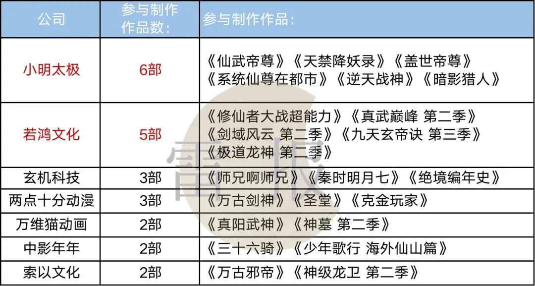 云图动漫、谜谭动画、中影年年、幻维数码、洛水花原这5家公司,在该片单中均参与制作3部作品,中影年年有续作《我是大神仙3》,幻维数码有年番《斗破苍穹》,洛水花原负责制作《狐妖小红娘11》。5家公司中有3家都曾获得腾讯投资。