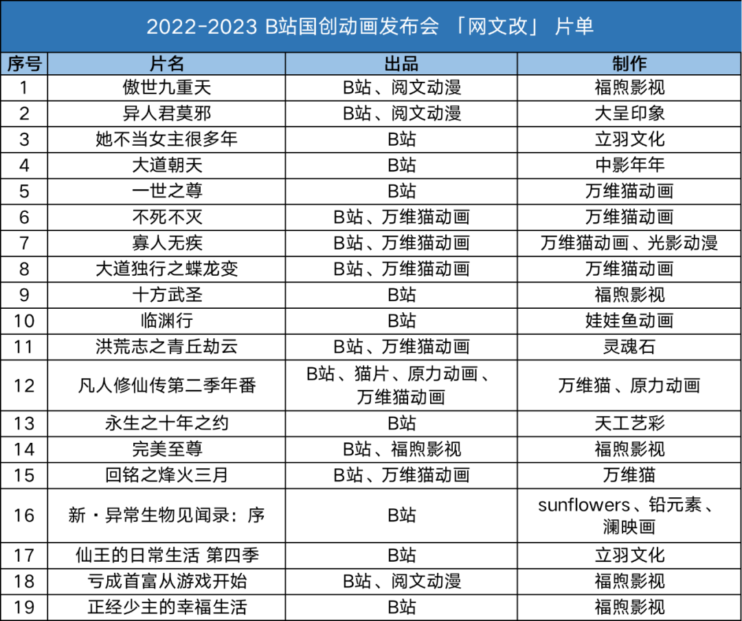 《大道朝天》制作方是中影年年,改编自连载于起点中文网和创世中文网的东方玄幻类同名小说,作者是网文《庆余年》《将夜》的作者猫腻。在起点中文网有674.13万总推荐;《一世之尊》改编自起点知名作家爱潜水的乌贼所著的一部东方玄幻修真类网络小说。在起点有309.04万总推荐。动画由万维猫动画负责制作。