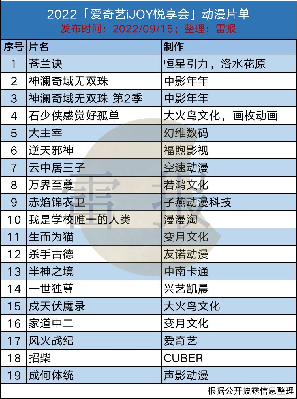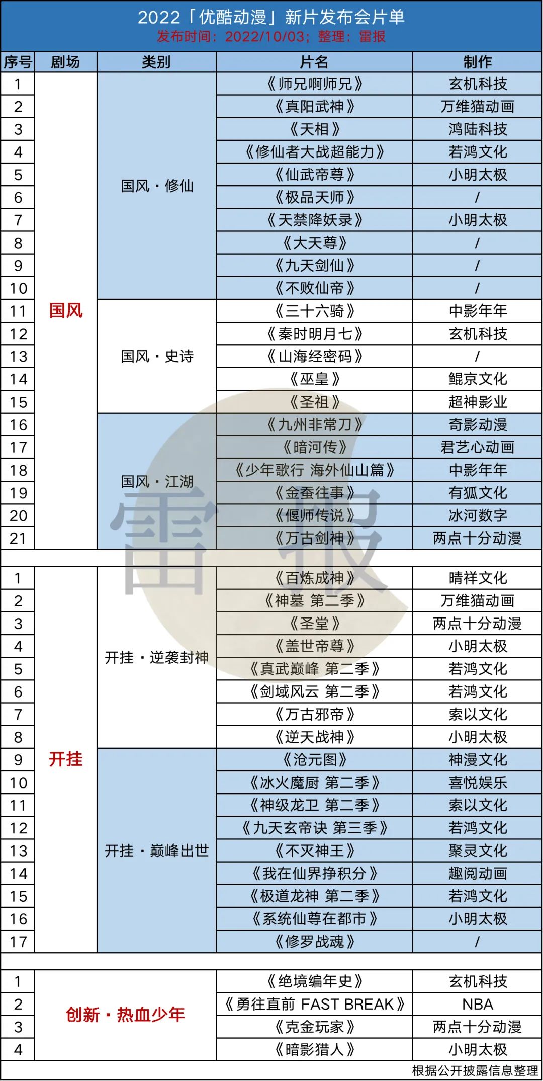 在这之前,腾讯8月举行的动画节上公布了数量为100部的片单;优酷10月3日的新片发布会上公布了42部;爱奇艺今年的悦享会上动漫片单包含19部。