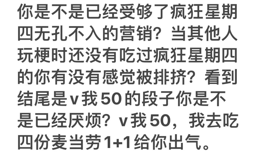 而尽管疯狂星期四文学一直火爆至今,以百胜的理念来看,很难说其是主动营销的结果。2020年,疯四开创两年后,肯德基才依据这点举办了疯四文学大赛。不久前的2022年,疯四文学再度出圈后,肯德基才姗姗来迟推出了“V我50卡”,然而,这一波的营销还因为与麦当劳的直接对垒而显得灰头土脸。