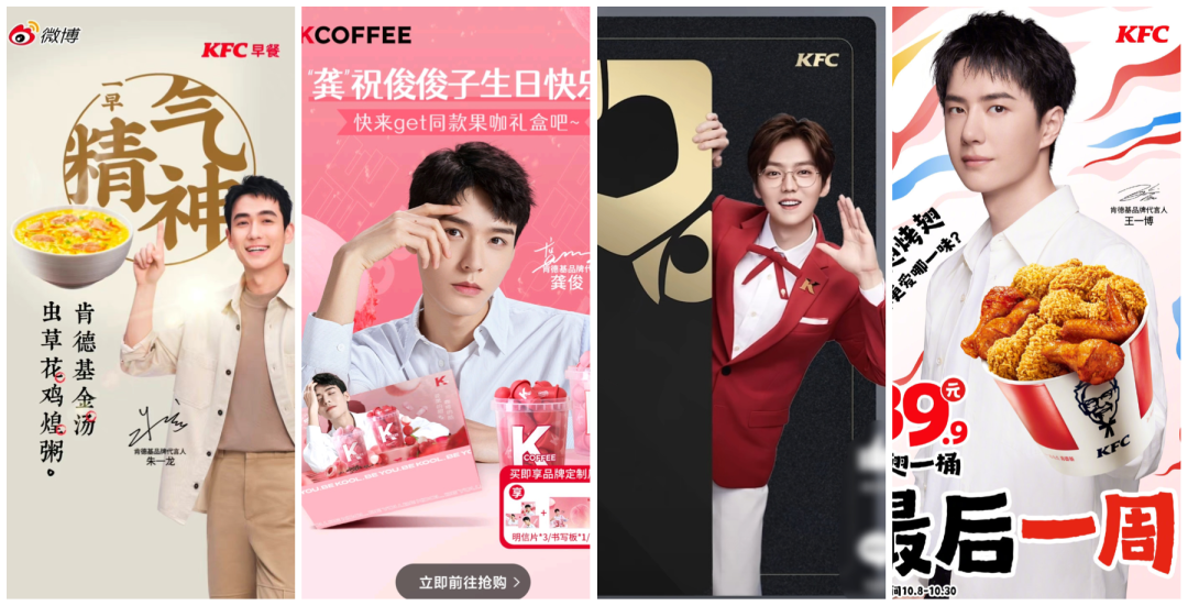 肯德基或许也从此意识到,流量的作用不可小觑。2014年,EXO的几位中国成员先后回国。流量时代开始,肯德基也搭上了快车。2016年开始,肯德基官宣鹿晗为其代言人。随后,黄子韬、王俊凯、王源、薛之谦、李宇春、朱一龙、王一博等流量明星先后成为肯德基的代言人。