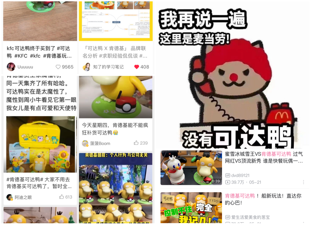 今年5月下旬,肯德基为儿童节准备的玩具套餐,是今年营销的代表案例。在肯德基的两份玩具套餐中,可以左右摇晃切换手势的可达鸭成为焦点。在微博或小红书等平台,拿到可达鸭成为了一件可以炫耀的事。而在抖音等短视频平台,围绕着可达鸭的特殊动作诞生的二创视频,成为了不少抖音网红的流量密码。