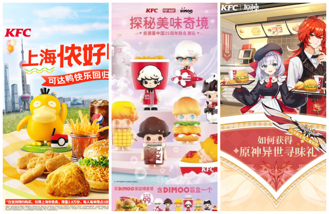 实际上,可达鸭的火爆,对肯德基来说也并非稀罕事。这件事往前数,肯德基层凭借跟泡泡玛特盲盒联动而将餐品在二手市场卖出了8倍的价格。再往前,肯德基还比必胜客更早就与国产二次元手游原神联动,在当时就贡献了不少名场面。