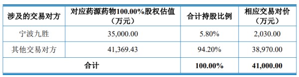 以2021年12月31日为评估基准日,药源药物100%股权的评估值为41180万元,交易各方参考评估结果,协商确定本次交易标的资产的最终交易价格为41000万元。另外,结合承担业绩承诺、利润补偿义务、股份锁定等因素,交易方案针对不同的交易对方采取了差异化定价,宁波九胜对应的标的资产估值为3.50亿元,其他交易对方对应的估值为4.14亿元。