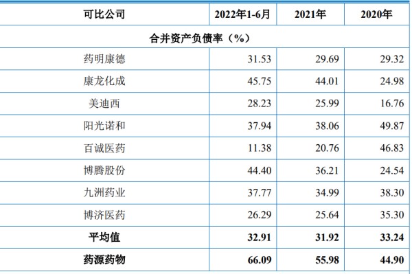 2022年6月末的负债总额相当于2020年年末的3.47倍,负债金额也是大量增长。由此,药源药物的资产负债率也明显高于各家可比公司及平均值。特别是2022年6月,药源药物负债率为66.09%,可比公司平均值为32.91%,药源药物负债率是平均值的2倍。