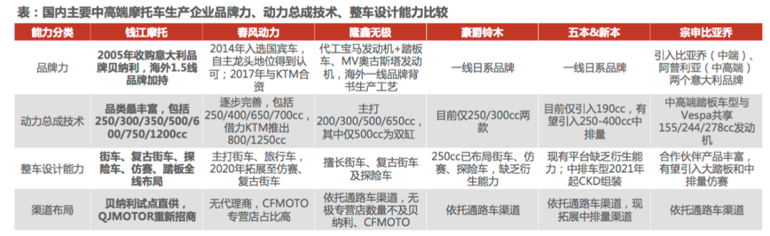 从供给端来看,在与国际品牌同台竞技、交流合作的过程中,国内公司的动力总成、整车设计、品牌宣传方面进步明显。目前,隆鑫通用(603766.SH)、钱江摩托、春风动力(603129.SH)等公司均具备了水冷发动机中大排量摩托车生产能力。根据街车、复古街车、旅行车、探险车、仿赛车等更加细分的赛道,推出了各自适合国人需求的车型。