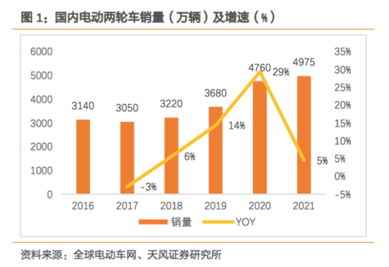 《新国标》要求,自2019年开始,不合规的电动自行车需要进行清退。如此背景下,电动两轮车销量迎来一波增长高峰,2019年、2020年同比增速分别为14%、29%,2021年出现下滑,但总量仍保持在高位。