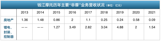 2013年,钱江摩托首次在年报中单列出“房地产”业务收入,2014年开始单列“锂电池、封装、控制器等非摩托车制造业”。梳理历年年报,这两部分业务均呈现营收波动较大的状况。而最多不足5亿元的数额,与公司30亿元左右的整体营收相比,差距较大。