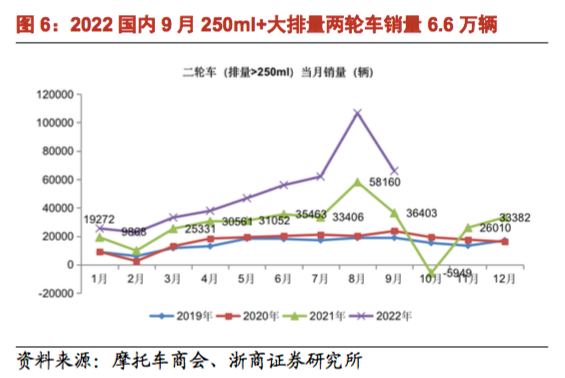 另据浙商证券相关研报,这一势头仍在延续。且从上图可以看出,除了2021年10月外,中大排量摩托车近年市场容量扩展快速且稳定。