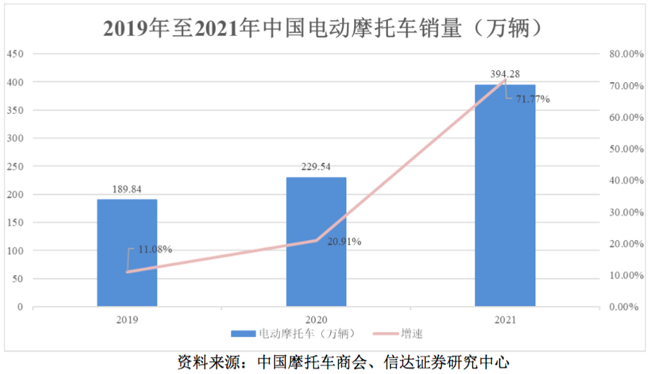 据中国摩托车商会、信达证券研究中心数据,2019至2021年我国电动摩托车总销量年复合增速达 44.11%。