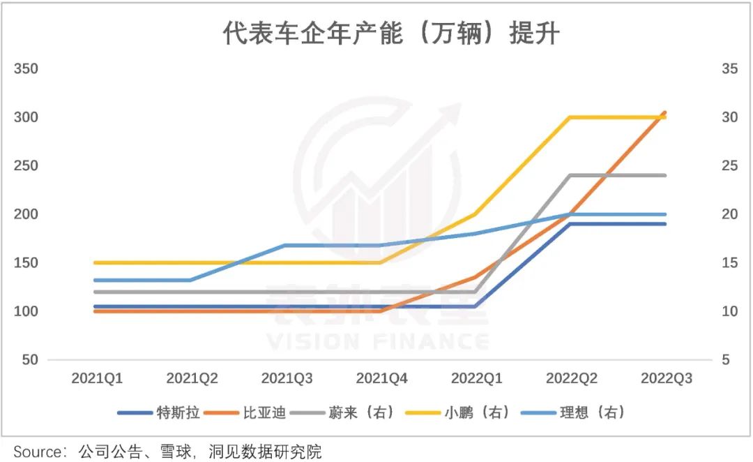 比亚迪的产能释放更加明显,可以看到,2021Q4-2022Q3,产能增加了约两倍。蔚小理的情况也类似,在2022Q2年基本实现了产能翻番。