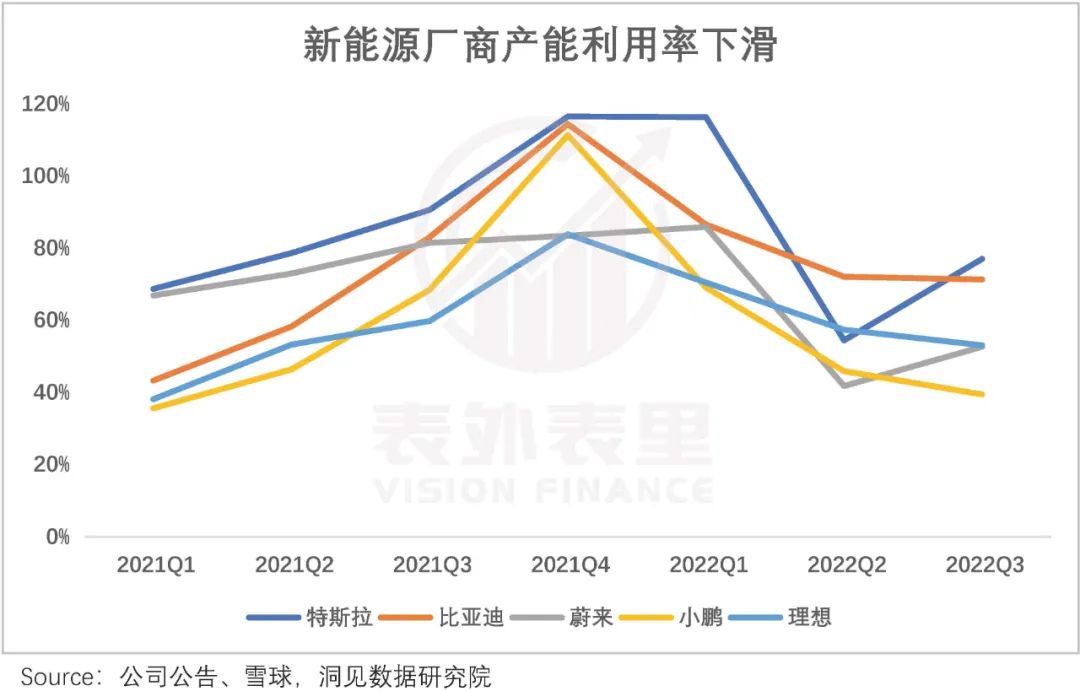 可以看到,2022Q1开始,各家的产能利用率普遍下降。2022Q3,相对较好的特斯拉和比亚迪,产能利用率也刚超过70%;而蔚来、理想在50%左右,小鹏不到40%。