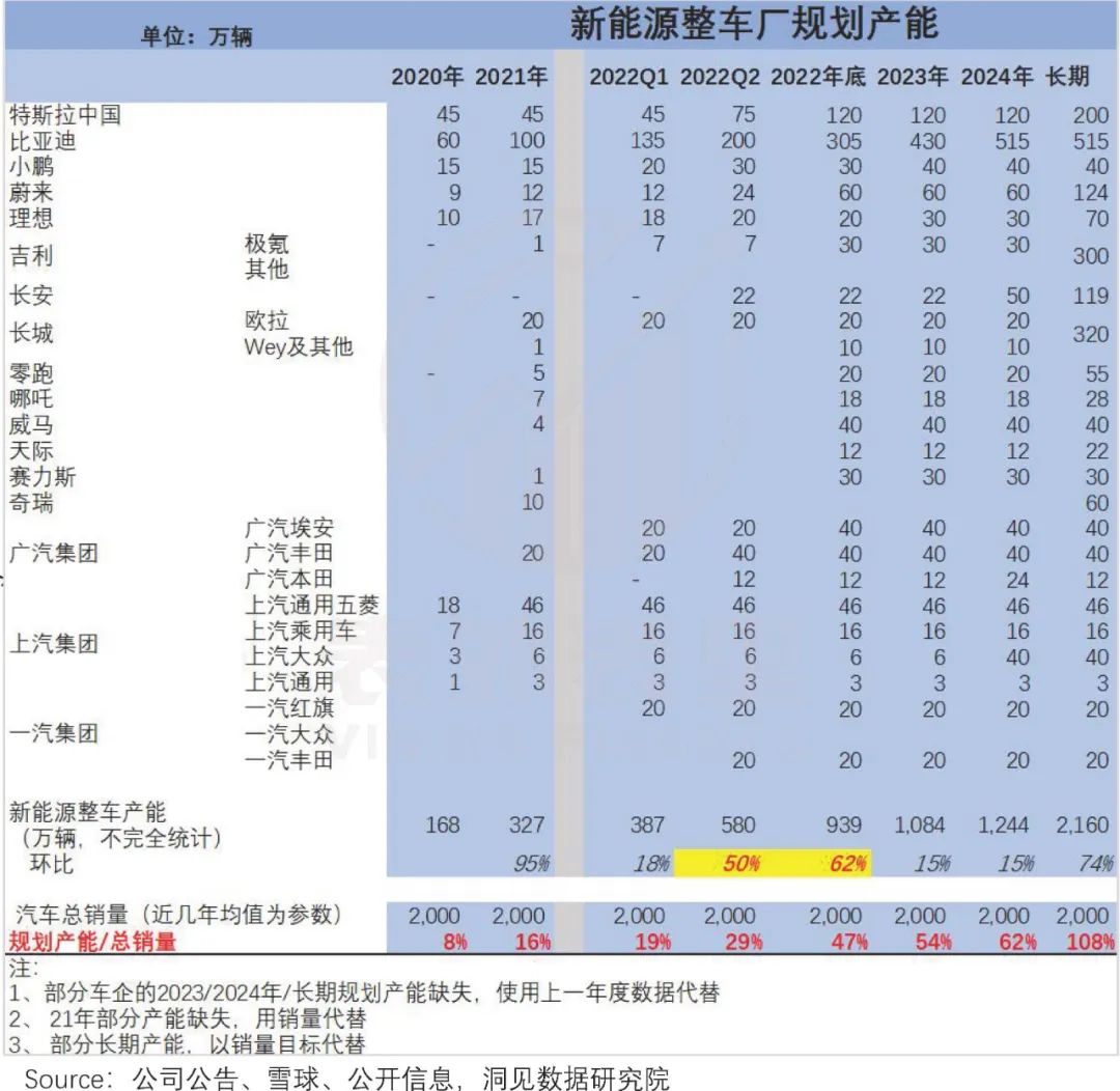 从行业角度,综合统计来看,2022年底,新能源车企们的产能将在Q2的基础上,增长62%。