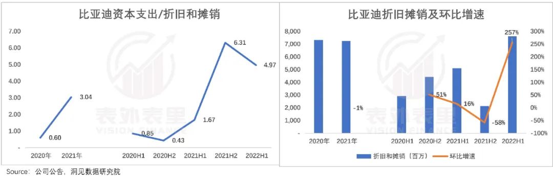 比如,比亚迪2021年新能源产能扩建,资本支出与折旧摊销的比例达到历史最高。2022H1新产能投产后,折旧摊销总额大幅提升,环比增加超2倍(好在比亚迪牢牢占据15~25万电动车销售老大位置)。