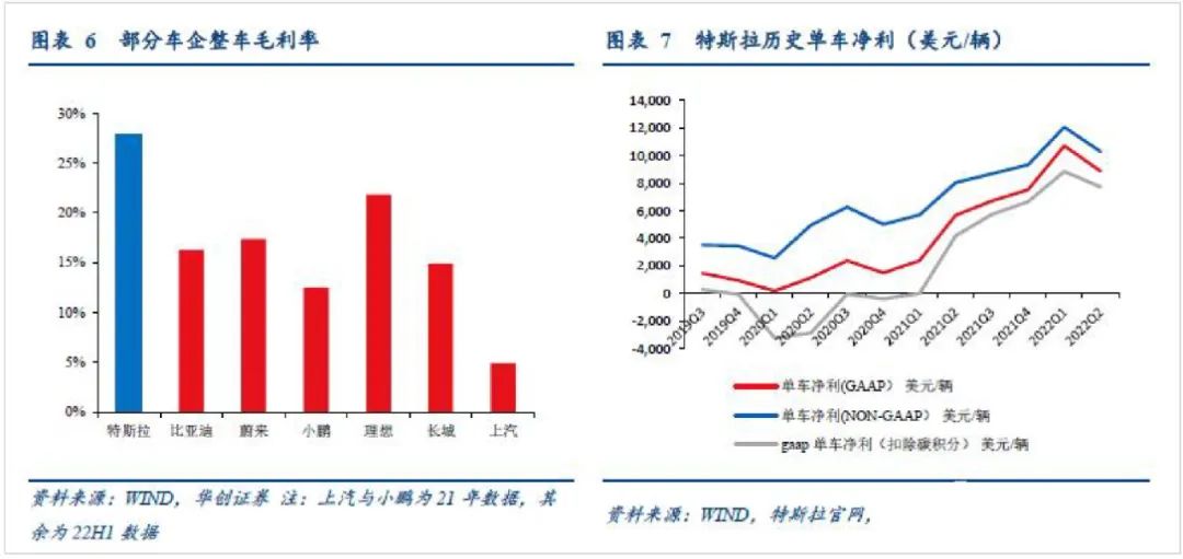 对特斯拉、比亚迪等产能利用率的厂商来说,利润空间厚,拼得起价格战。如下图,特斯拉整车毛利率2022H1达27.8%,单车盈利也高,2022Q2每卖1辆车约赚1万美元。
