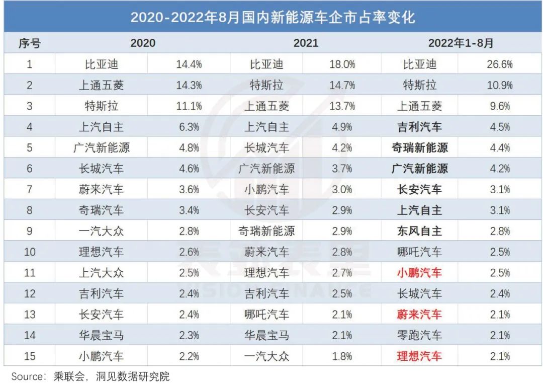 如下图,2022年1-8月,蔚小理的市占率均有所下滑。与之相比,比亚迪、吉利、广汽新能源等传统车企和其他新势力,市占率有所增长。