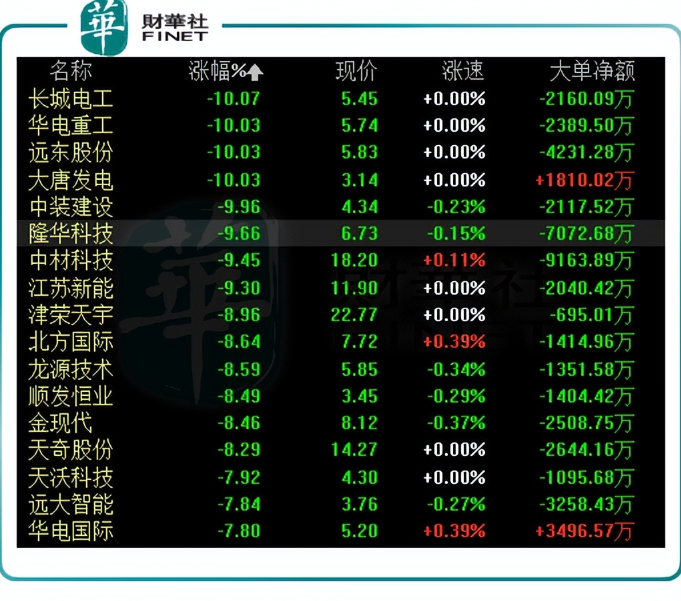 10月28日,风电板块继续走低,截至收盘,长城电工(600192.SH)华电重工(601226.SH)、远东股份(600869.SH)、大唐发电(601991.SH)跌停,中装建设(002822.SZ)、隆华科技(300263.SZ)、中材科技(002080.SZ)、江苏新能(603693.SH)、津荣天宇(300988.SZ)纷纷跟跌。