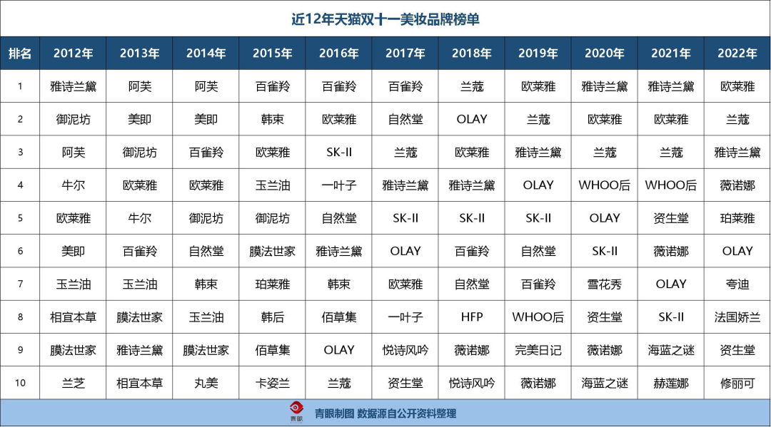2020年,天猫双十一美妆前十品牌分别来自于欧莱雅集团(欧莱雅、兰蔻)、雅诗兰黛集团(雅诗兰黛、海蓝之谜)、LG生活健康(Whoo后)、宝洁(OLAY、SK-II)、爱茉莉太平洋(雪花秀)、资生堂集团(资生堂)、贝泰妮(薇诺娜)。2021年榜单与2020年相差无几,仅是由欧莱雅集团旗下的赫莲娜替换了雪花秀。