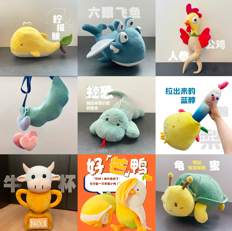 而在短视频品台上,也有不少玩具品牌借助趣味内容成功破圈。例如优趣优品账号就通过玩转谐音梗的方式,成功在竞争极为惨烈的毛绒玩具领域“杀”出了一条血路,经典的“龟蜜”、“鲨bee”、“大蚌壳”、“小蛇恐”、“勾心豆角包”、“人参公鸡”“好芒鸭”等一些谐音梗创意产品,更是把账号频频推上话题榜,取得了2074.8万赞,221.7万粉丝的优异成绩。