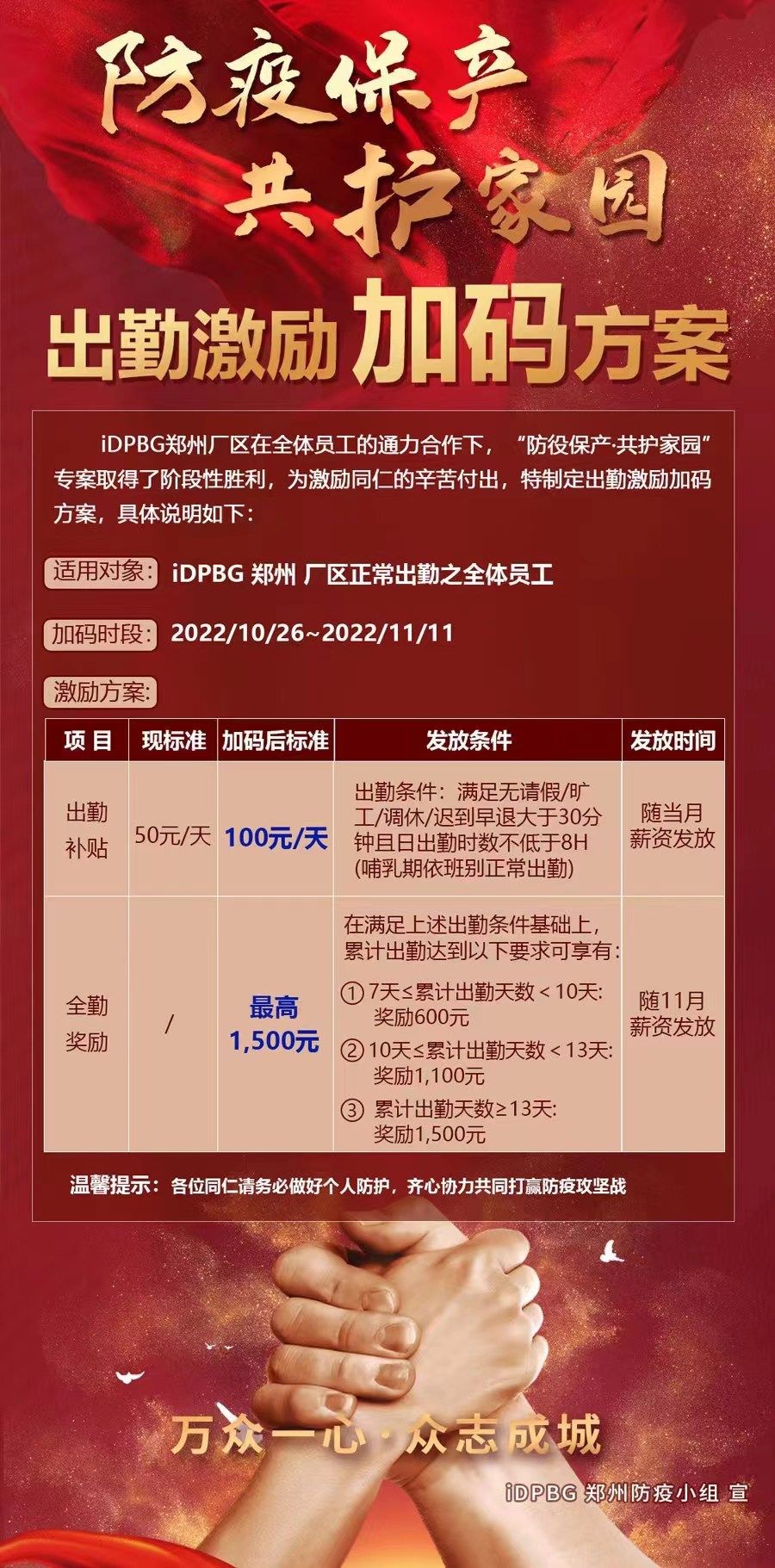 一位在10月30日离开港区富士康的前员工告诉界面新闻,疫情发生以来,工厂从未停止生产,为激励员工出勤还开出了补助。10月26日以前,正常出勤的员工可获得50元/天的补贴,在10月26日以后,这一补贴加码至100元/天,全勤则最高奖励1500元。这位员工在负责iPhone成品组装的IDPBG事业群,这也是港区富士康规模最大的事业群。