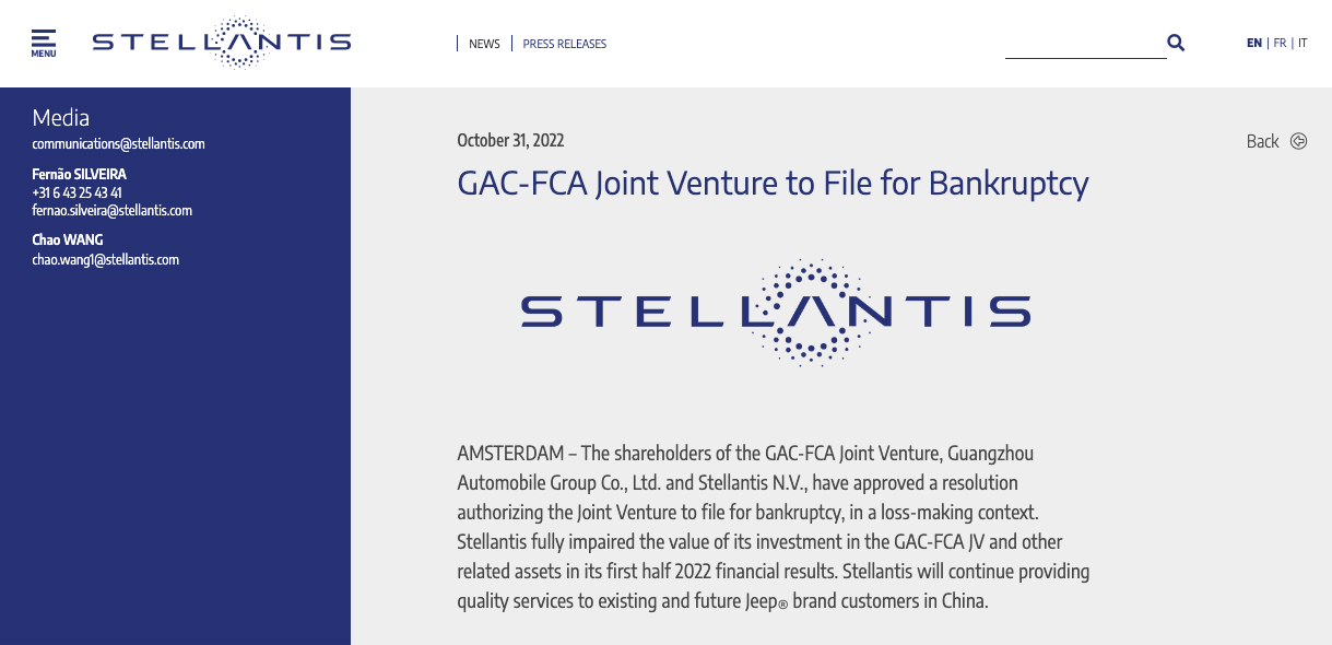 10月31日,Stellantis官网宣布,广汽菲克、广汽集团和Stellantis的股东已批准一项决议,授权广汽菲克在亏损的情况下申请破产。Stellantis已在2022年上半年的财务业绩中对其在广汽菲克的投资及其他相关资产进行了全面减值。Stellantis表示,将继续为中国现有和未来的Jeep品牌客户提供服务。