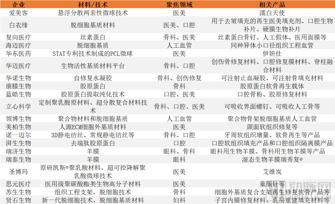 新兴组织再生材料企业在医美、骨科两大方向的投入力度较大