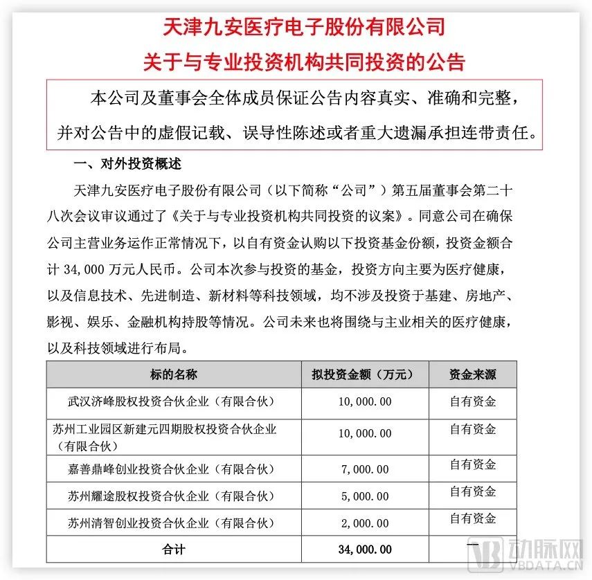 近日,九安医疗公告称,拟以自有资金投资5家基金,投资合计金额3.4亿元,投资方向主要为医疗健康,以及信息技术、先进制造、新材料等科技领域。九安医疗期望通过做LP的方式,为公司发展找到新的增长点。