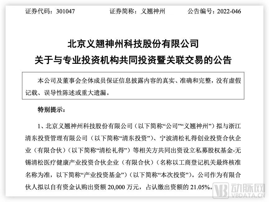 义翘神州在今年7月份发布公告,拟与浙江清东投资管理有限公司、宁波清松礼得创业投资合伙企业等相关方共同出资设立私募股权基金——无锡清松医疗健康产业投资合伙企业,拟以自有资金认购出资额2亿元,占认缴出资额的21.05%。