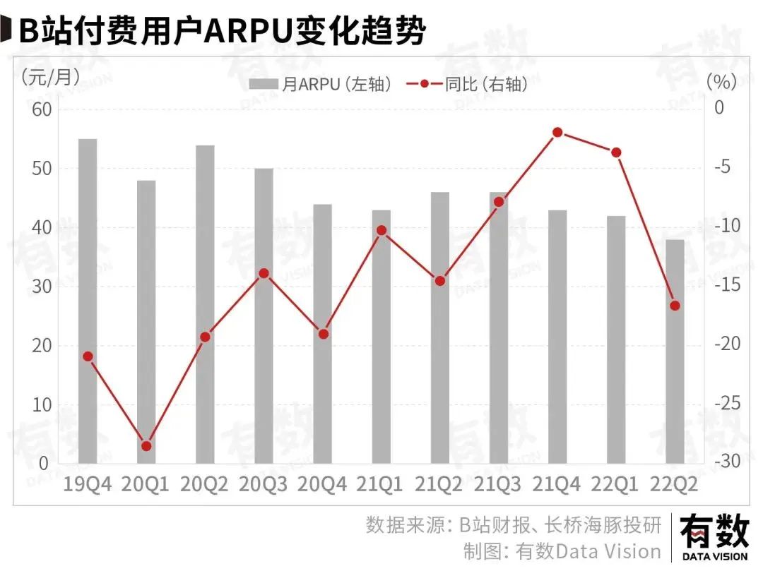 但从直播到电商,这中间的转化需要过程,而B站的劣势一是没有电商基因,在“人、货、场”三要素中完全没有“货”的基础;二是因为受众年龄、圈层的问题,消费力层面其实要弱于主流消费人群,且付费用户ARPU数据在过去三个季度持续同比下滑。