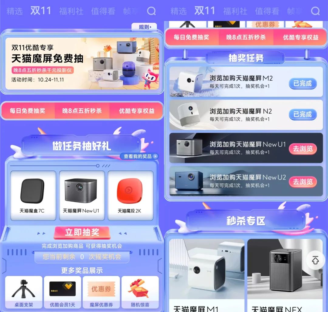 今年优酷的会员专区,依然出现了“双11”分区,如果点进去会发现其实是一个天猫魔屏的活动页面,同时也为优酷会员提供了专属福利,只要浏览相关页面完成任务,即可参与免费抽奖,有机会领取天猫魔屏New U1等产品。