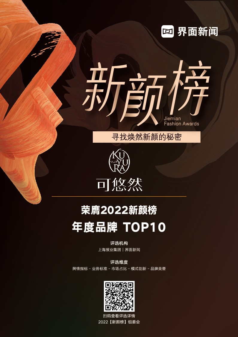 11月1日,由上海报业集团|界面新闻主办的【界面时尚力峰会】于深圳举办,会上公布了2022【新颜榜】终榜名单并为获奖品牌及企业颁发奖杯。KUYURA可悠然凭借其优秀的品牌表现力成功上榜2022【新颜榜】年度品牌TOP10。