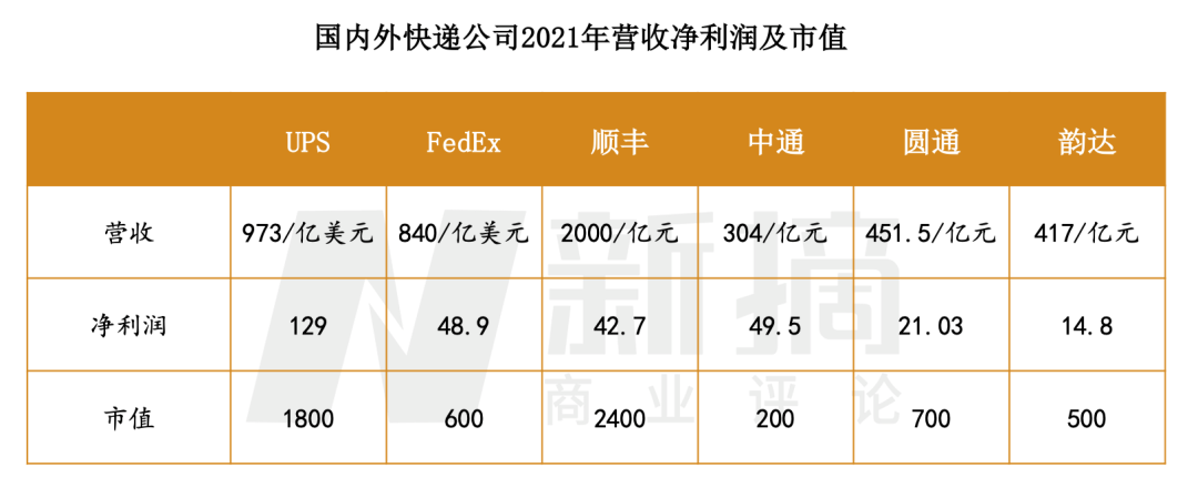 UPS2021年市值1800亿美元,联邦快递FedEx的市值600亿,对比我们国内市值最高的顺丰才2400多亿人民币,营收净利润分别为2000亿和42.7亿人民币。