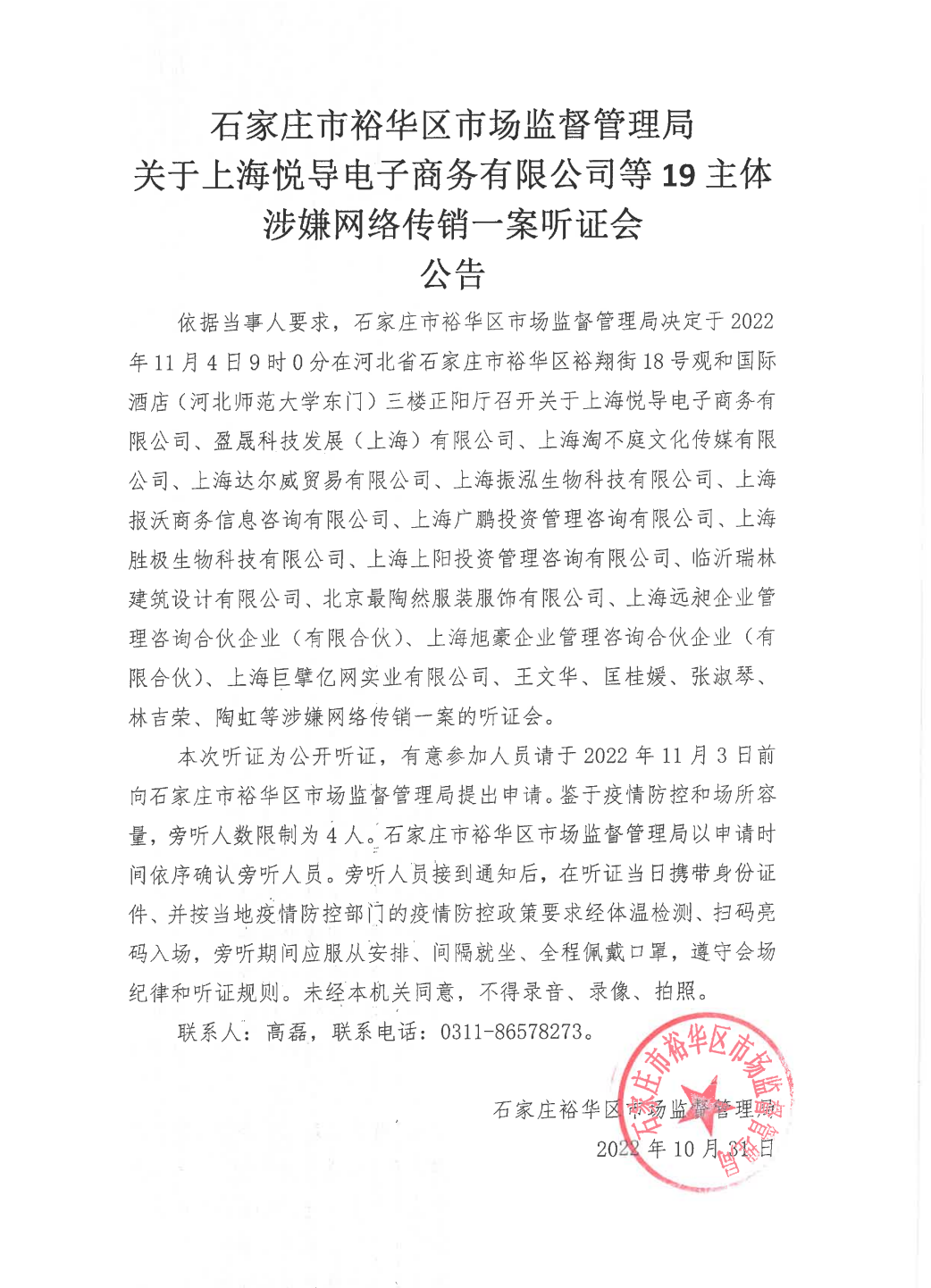 据石家庄市裕华区人民政府网站消息,上海悦导电子商务公司等19主体涉嫌网络传销一案听证会将于11月4日在石家庄召开,涉案主体包括张庭夫妇、陶虹等。(澎湃新闻)