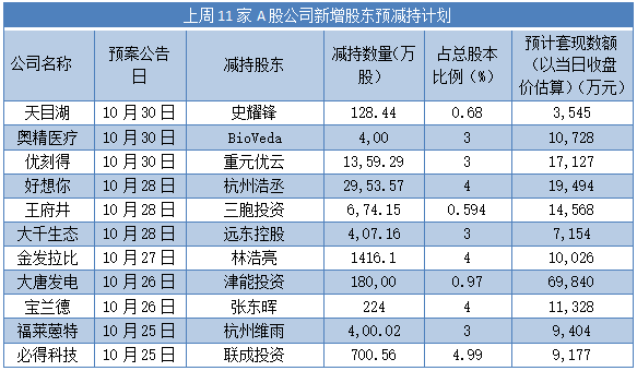 上周(8月1日至8月5日),据界面新闻不完全统计,共有11家A股公司披露股东减持计划。