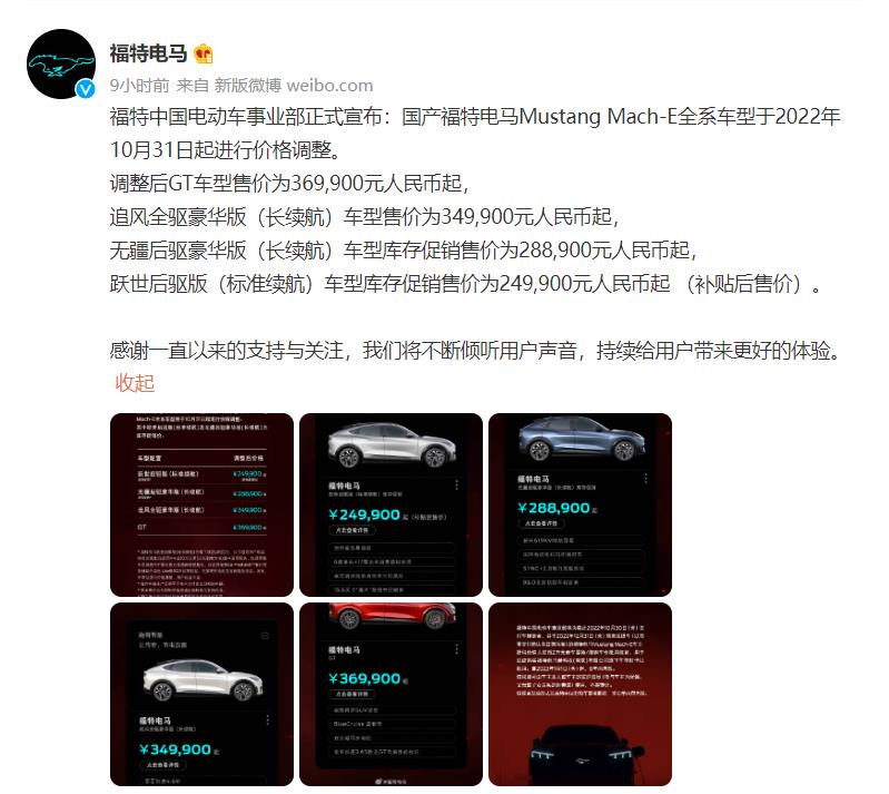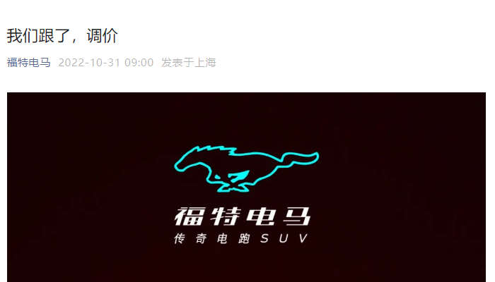 10月31日,据福特电马官方社交媒体消息,国产福特电马 Mach-E全系车型于2022年10月31日起进行价格调整,对全系车型进行降价,幅度为2至2.8万元。