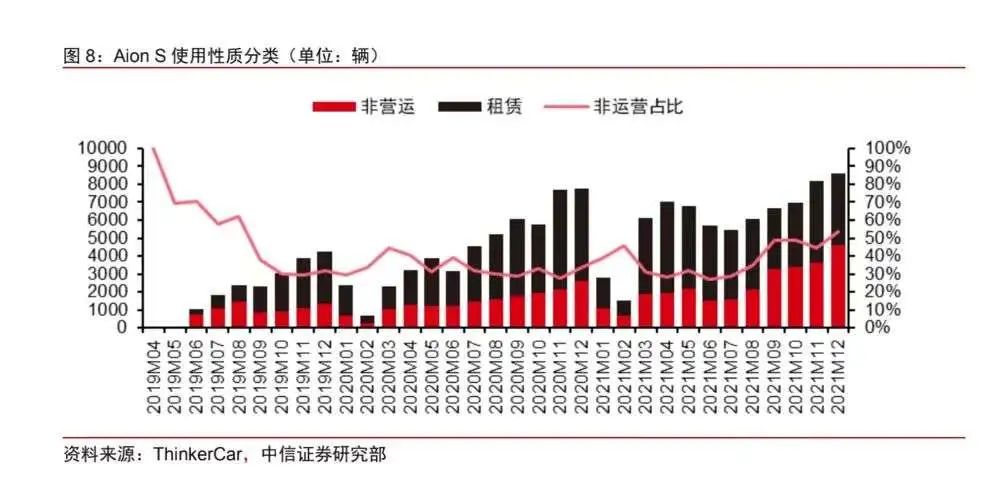 上险量数据显示,2021年埃安总销量中,43%来自B端市场,其中销量最高的AION S有63%来自B端。