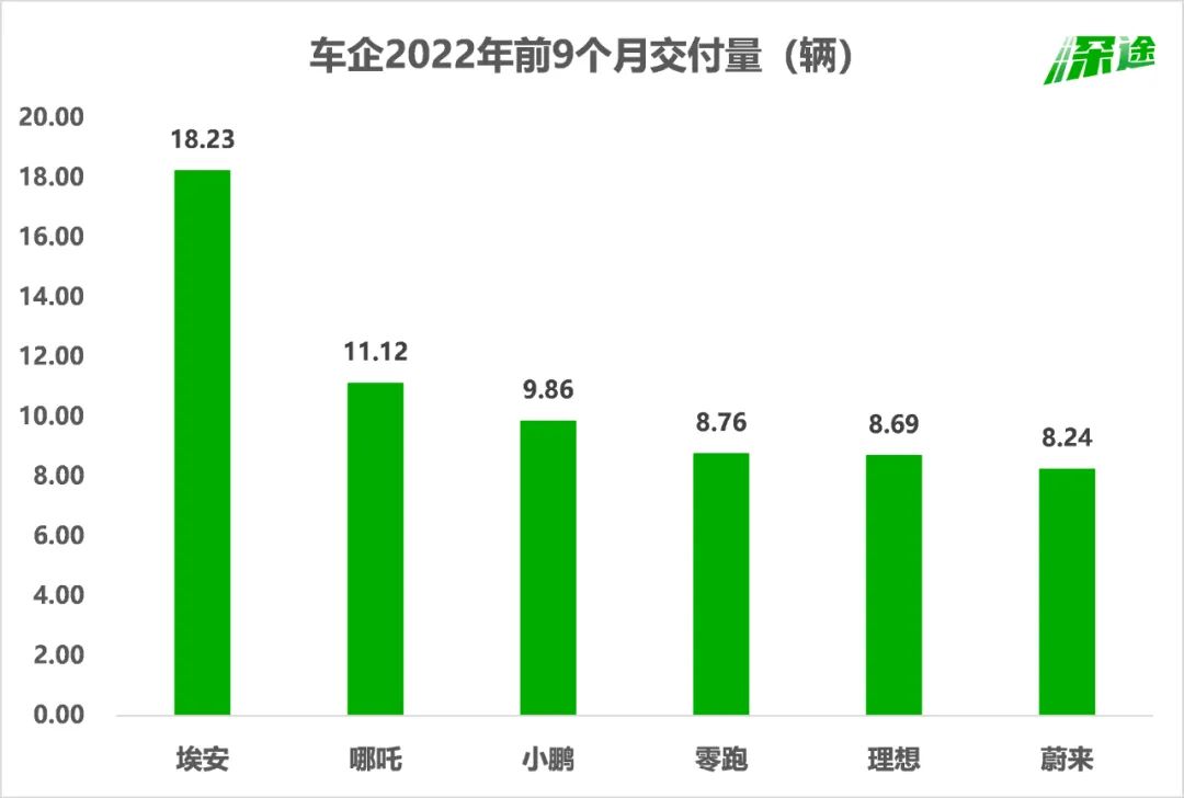 去年行业公认的新势力销冠是小鹏,全年交付了接近10万辆。理想和蔚来都是9万辆出头。埃安的销量是12万辆。今年截止到9月底的新势力销冠是哪吒,交付了11万辆,而埃安是18万辆。