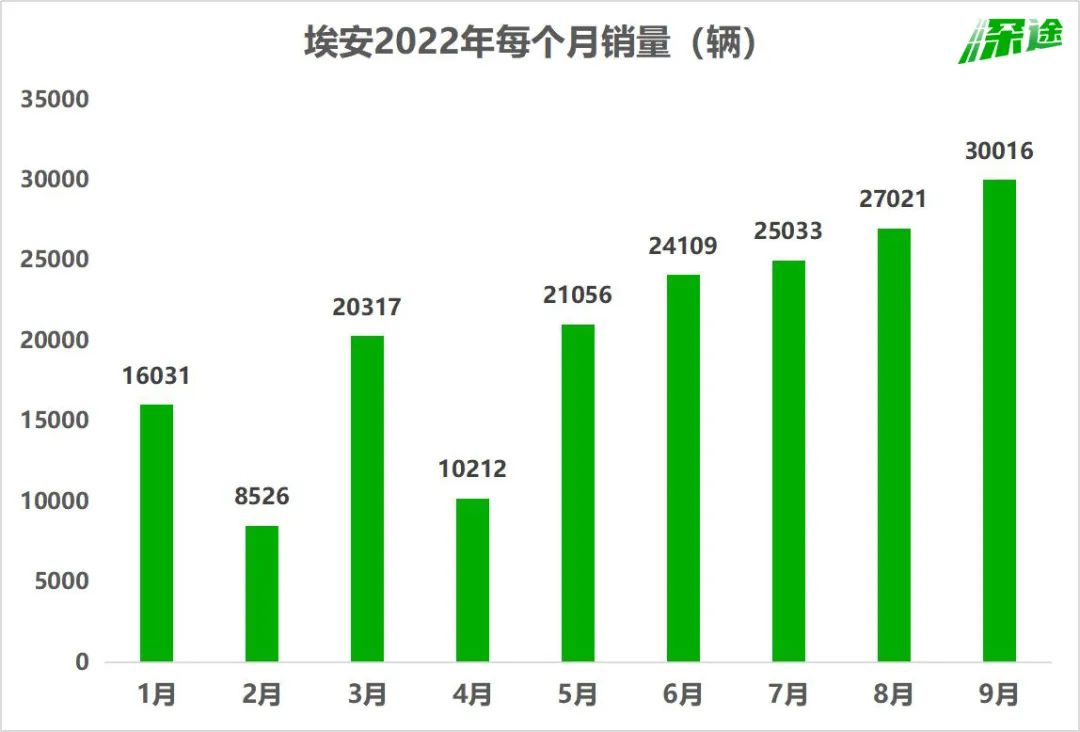 2019年、2020年、2021年及2022年1-9月,埃安的销量分别为4.2万辆、6万辆、12.02万辆和18.23万辆。