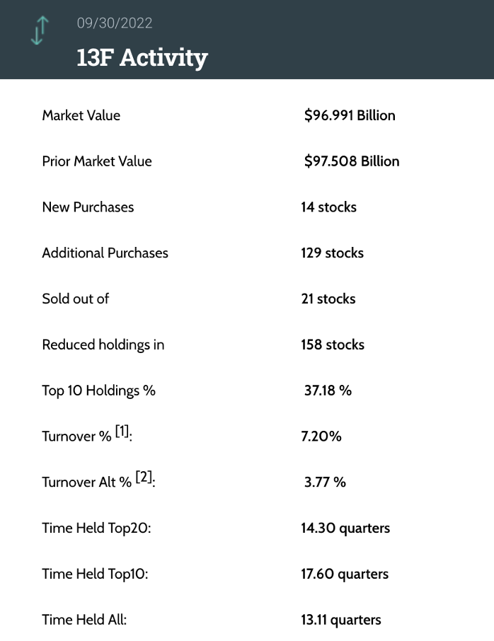 截至2022年三季度末,柏基投资美股组合的持仓规模为969.91亿美元。与二季度末相比,其美股组合规模减少5.17亿美元。在第三季度,柏基投资卖出了21支股票,新买入14支股票,增持129支股票,减持158支股票,换手率为7.20%。