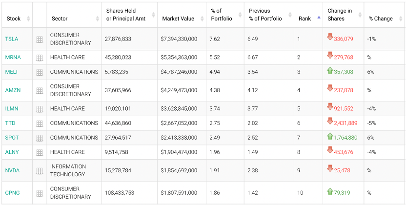 截至2022年9月30日,柏基投资的美股组合中的前10大重仓股分别为:特斯拉(TSLA)、美国生物制药公司“莫德纳” (MRNA)、阿根廷电子商务公司“自由市场” (MELI)、亚马逊(AMZN)、美国生物科技公司因美纳 (ILMN)、美国科技公司“萃弈”(TTD)、瑞典音乐流媒体平台“声田”(SPOT)、美国生物制药公司“艾拉伦” (ALNY)、英伟达 (NVDA)、韩国电子商务公司“库邦”(CPNG)。