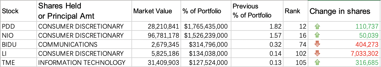 截至2022年第三季度,柏基投资的中概股组合中前五名分别为:拼多多(PDD)(第12名)、蔚来汽车(NIO)(第16名)、百度(BIDU)(第74名)、理想汽车(LI)(第102名)和腾讯音乐(TME)(第105名)。