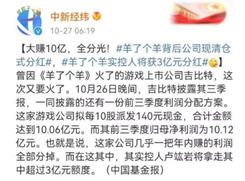 10月27日,#羊了个羊背后公司现清仓式分红#登上热搜榜。很多网友看到这个热搜,大概都会感慨,之前爆红的小游戏“羊了个羊”太赚钱了,甚至在各个平台,有一些大v也发出类似“人家做一个游戏赚10亿,立马分完”的观点,也引起部分网友的认同和转发。